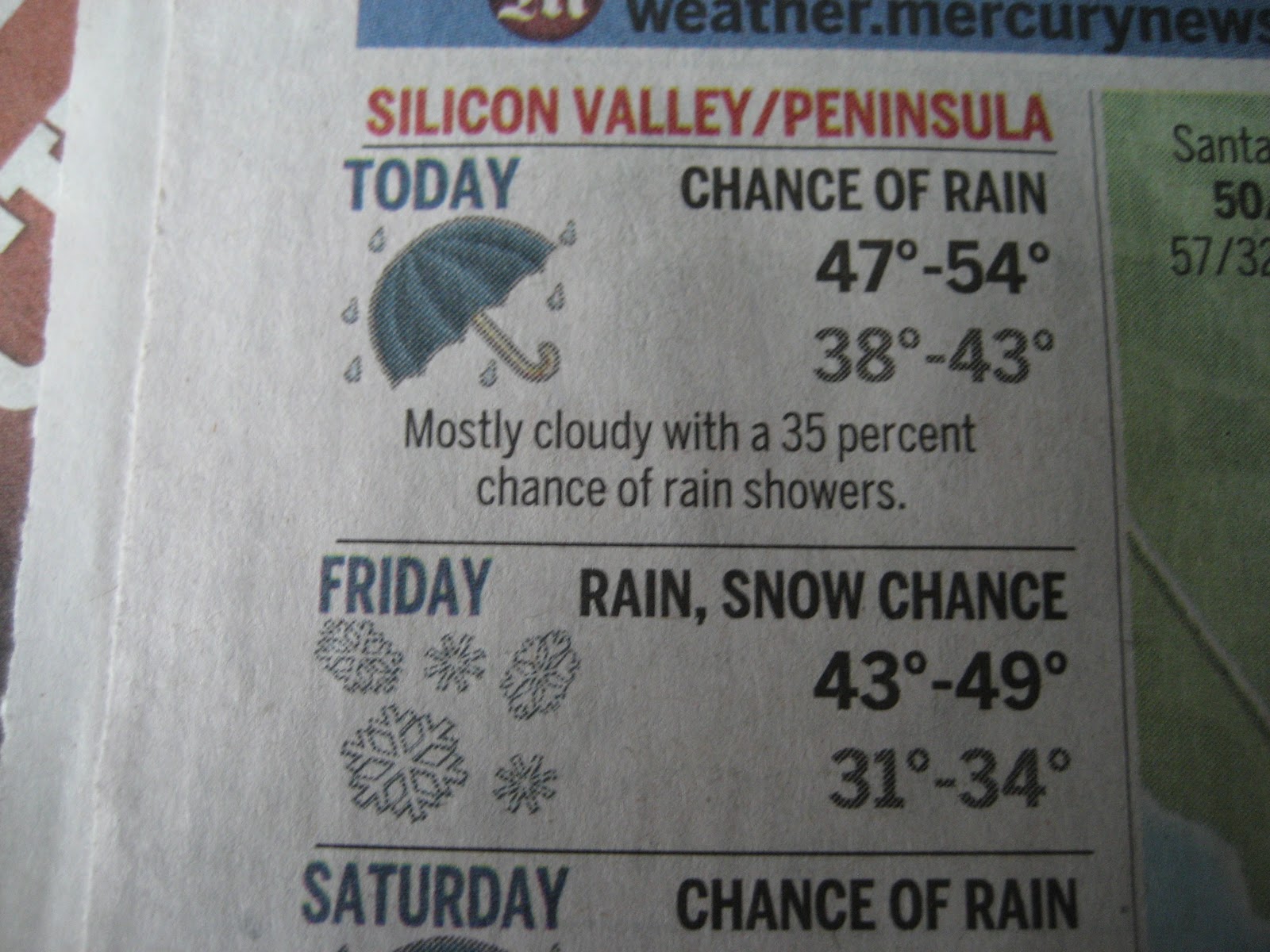 Will it snow in California tomorrow? Maybe. Here is a photo of the weather forecast in the paper today. I've never seen snow in the local forecast before. We'll see if it really does.